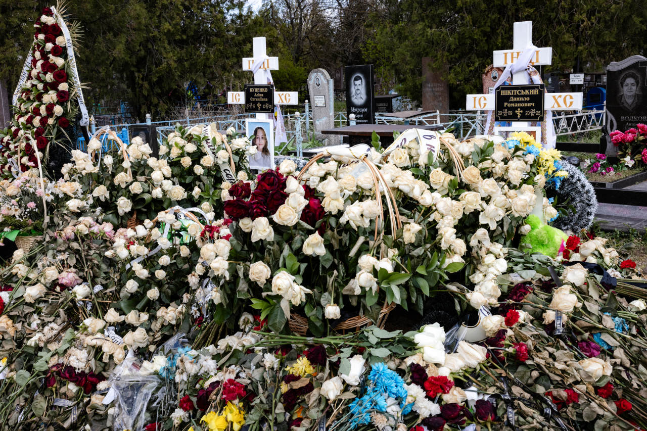 Alina and Danylo were laid to rest next to each other, close to little Tymofiy, who at three years old was the youngest casualty of the attack. Beside Alina in her casket lay a plush beaver that Danylo had gifted her. Using the final 1,100 hryvnia ($27) from Danylo’s savings jar, his parents purchased a flower arrangement for her gravesite. His mother mentioned that these were the sole blooms still fresh when they revisited the graveyard a week afterward.