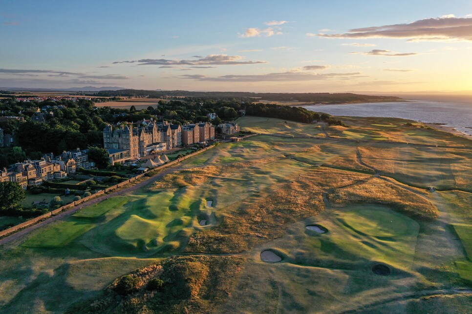 NORTH BERWICK, SCOTLAND – On August 4, an overhead shot captured the 433-yard Par 4 second hole named “Sea,” followed by the challenging 459-yard Par 4 third hole called “Trap.” Behind these holes lies the 378-yard Par 4 sixteenth hole known as “Gate” near the historic Marine Hotel at the North Berwick Golf Club in North Berwick, Scotland. The image was taken by photographer David Cannon for Getty Images.