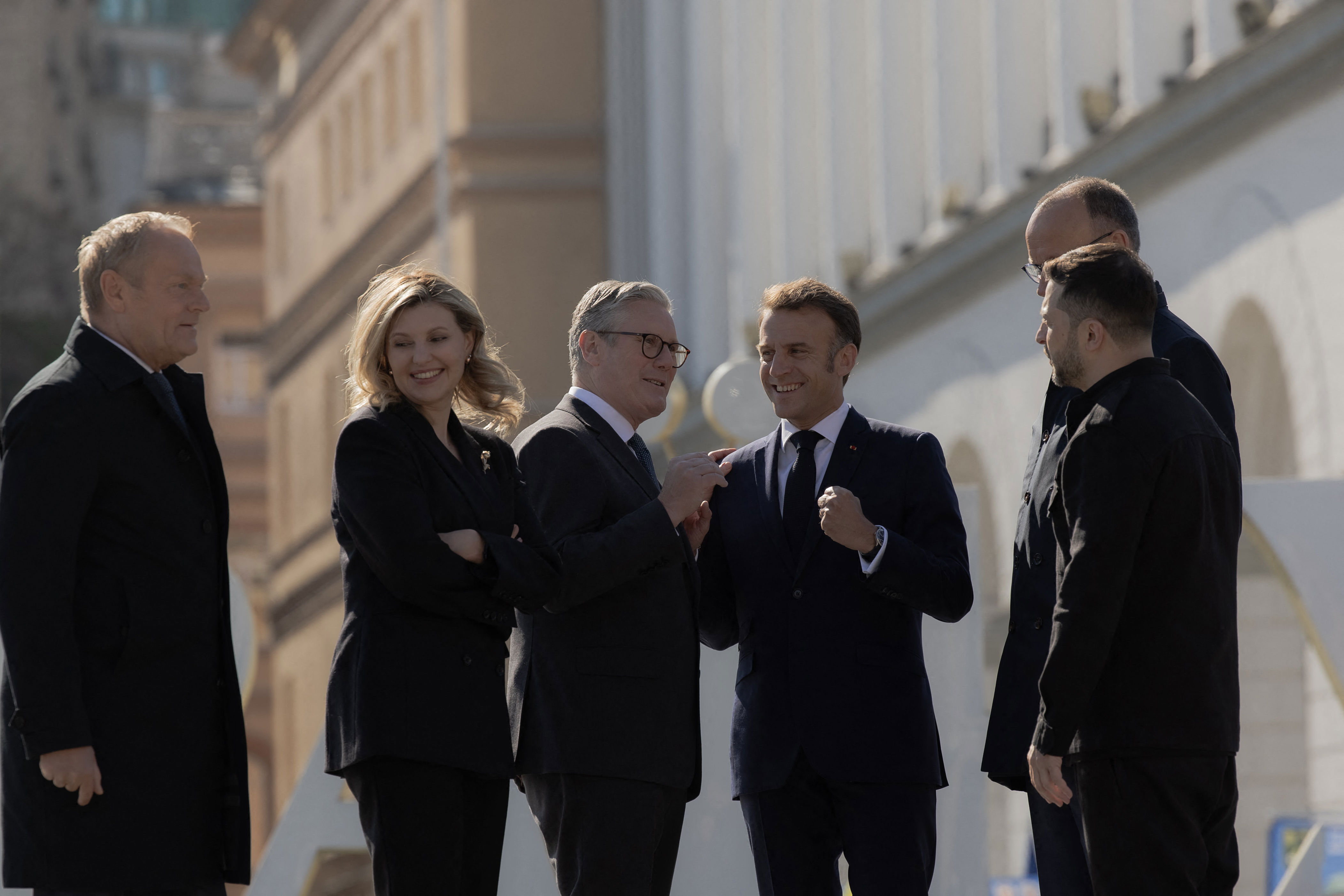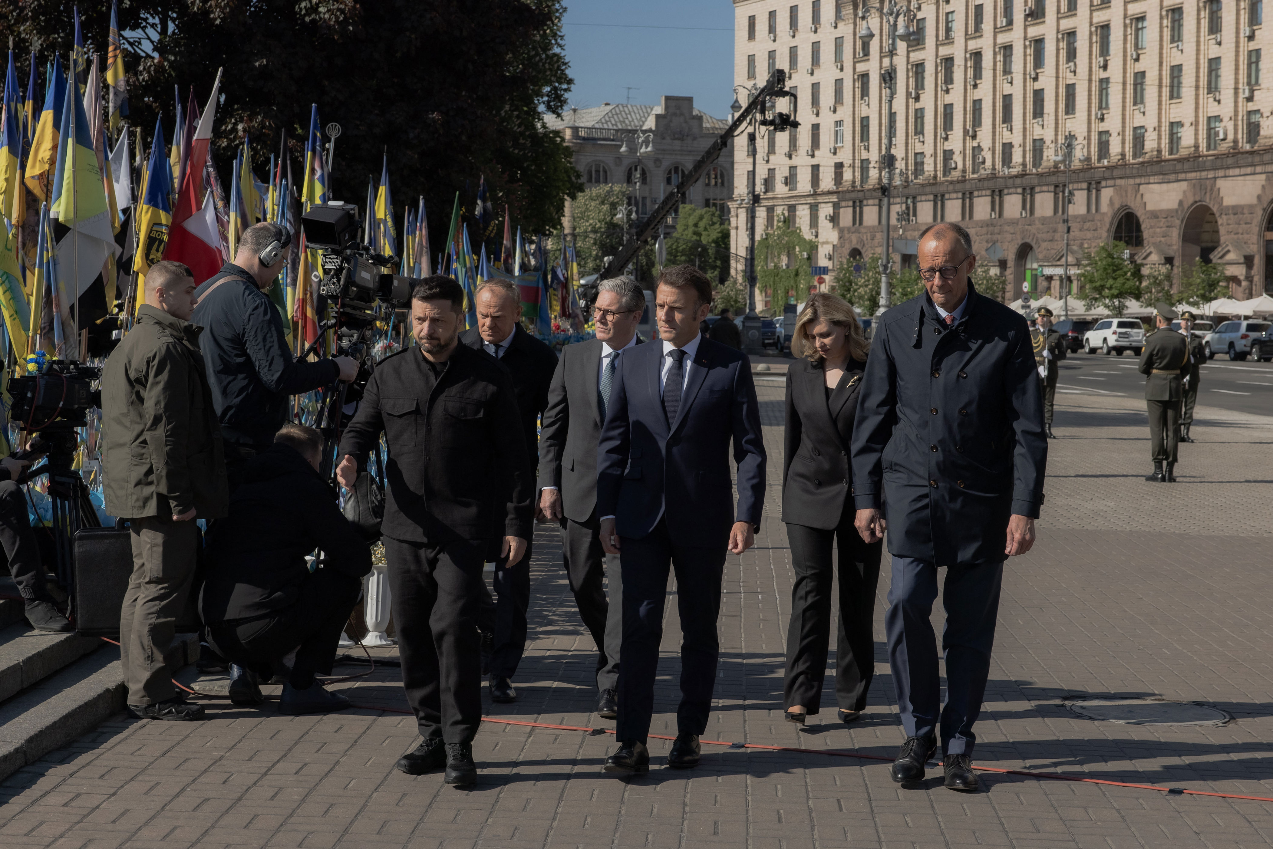 Leaders including Donald Tusk, Sir Keir Starmer, Olena Zelenska, Volodymyr Zelensky, Emmanuel Macron, and Friedrich Merz gathered together at Independence Square in Kyiv.